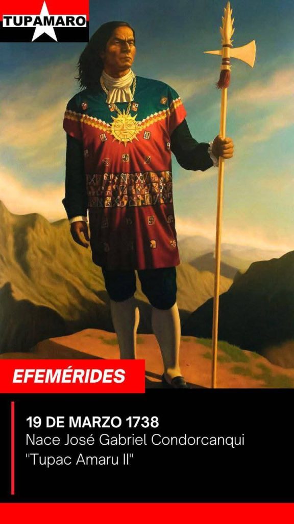 En el Movimiento Revoluciónario TUPAMARO le Honramos la memoria del gran Soldado del Sur José Gabriel Condorcanqui, Túpac Amaru II, a 288 años de su nacimiento. Líder indiscutible que encendió la chispa de la libertad en América contra la opresión colonial. Su grito de rebeldía sigue vigente en cada pueblo que lucha por su soberanía, su lucha se hizo realidad en la conciencia de los pueblos originarios. Tupac Amaru II, eterno defensor de este continente, hoy vive en la lucha anticolonialista que aún libramos los que habitamos en esta Gran Patria Nuestra América, garra de Lucha, Resistencia Popular .